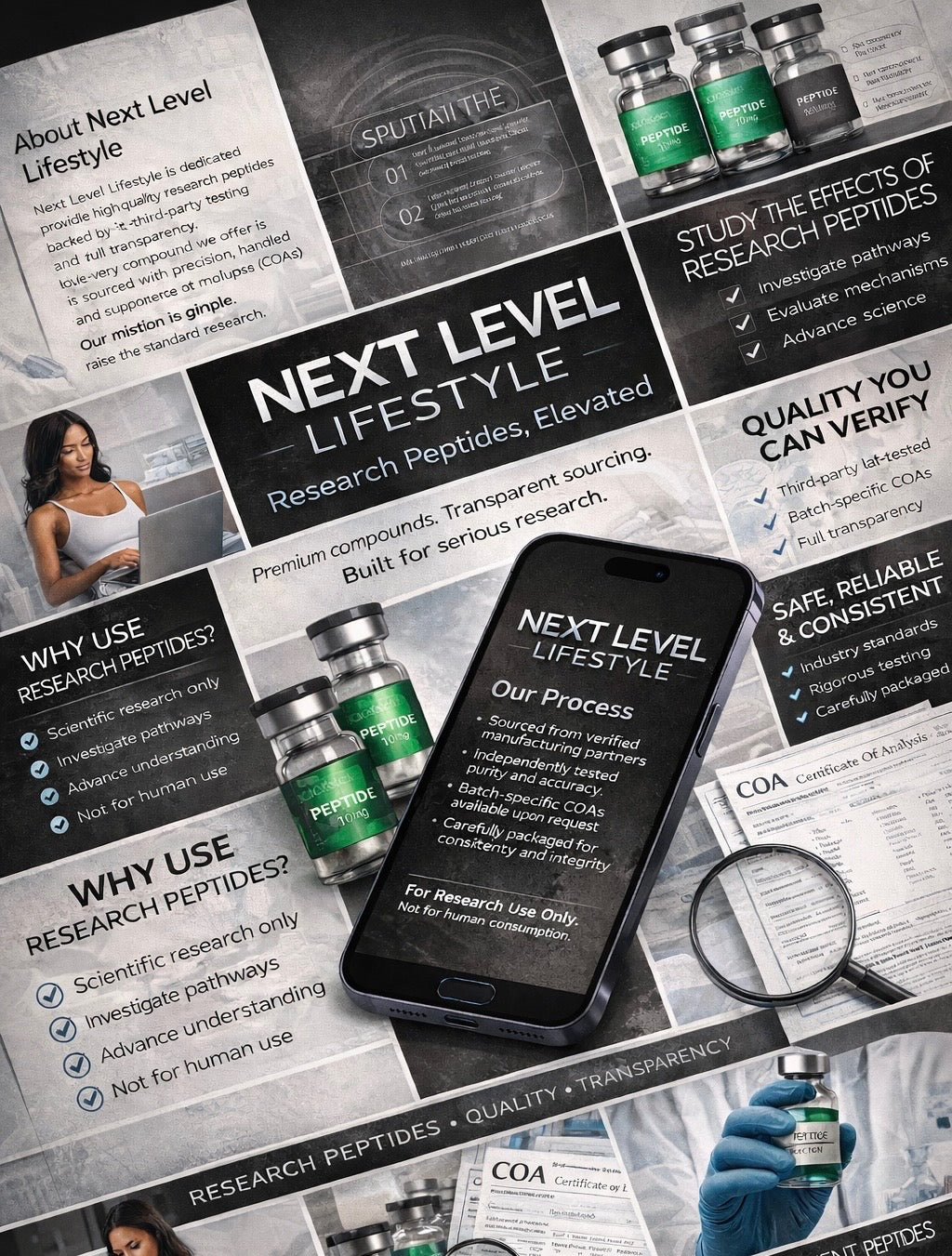 Next Level Lifestyle provides high-quality research peptides backed by full COA’s to ensure purity, identity, and consistency. Our products are sourced from trusted laboratories and handheld with strict quality control to support accurate and reliable research.